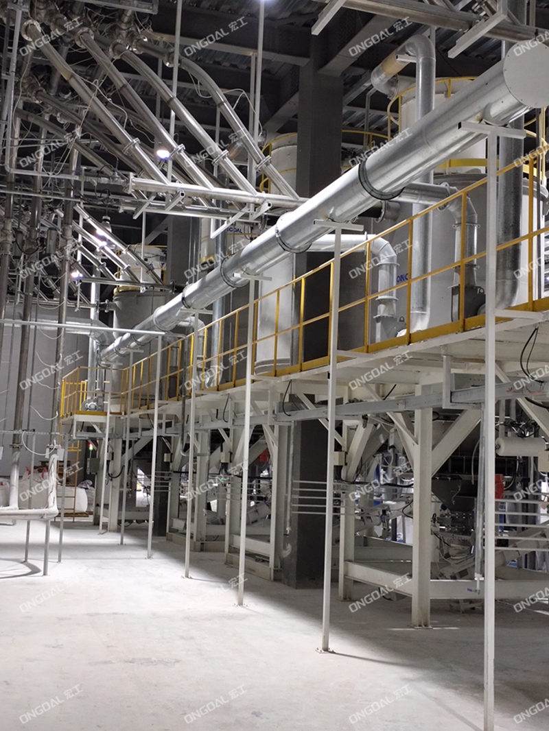 在物料預(yù)處理環(huán)節(jié),創(chuàng)新采用噸包破包工作站,對(duì)1種重鈣與3種輕鈣原料進(jìn)行集中拆包處理,配置專用除塵裝置實(shí)現(xiàn)無(wú)塵化作業(yè)。四類物料經(jīng)封閉式管道分別輸送至獨(dú)立的大型儲(chǔ)料倉(cāng),通過(guò)倉(cāng)體結(jié)構(gòu)優(yōu)化與流化裝置設(shè)計(jì),有效避免粉體板結(jié)、架橋等問(wèn)題,確保原料存儲(chǔ)穩(wěn)定性。