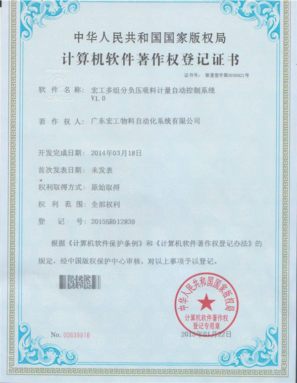 軟件著作權(quán)-宏工多組份負(fù)壓吸料計量自動控制系統(tǒng)V1.0