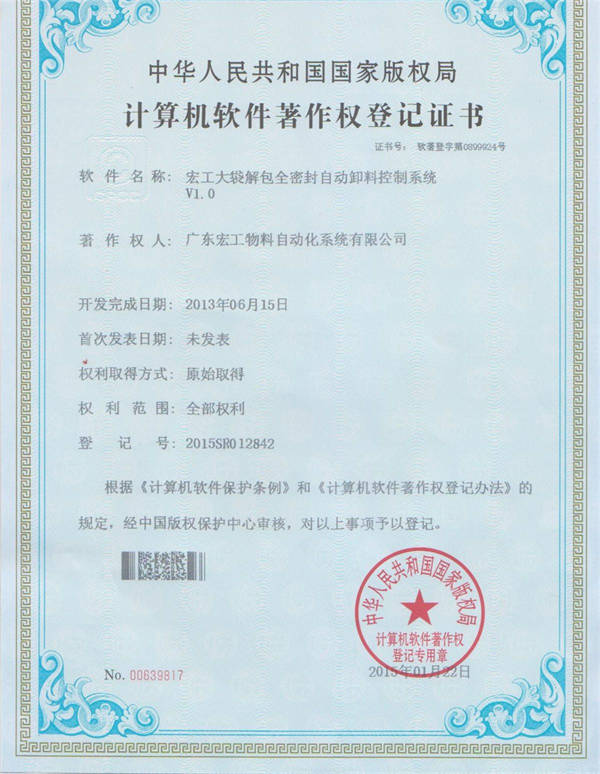 軟件著作權(quán)-宏工大袋解包全密封自動卸料控制系統(tǒng)V1.0