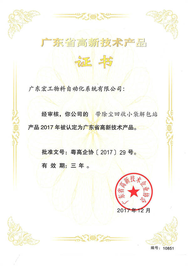 高新技術(shù)產(chǎn)品認(rèn)定-帶除塵回收小袋解包站